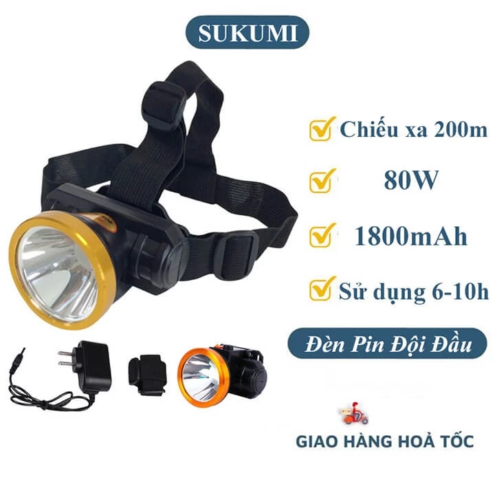- Đèn pin đội đầu siêu sáng 1 bóng chiếu xa 200m, công suất 80W: Phù hợp cho các hoạt động ngoài trời đòi hỏi ánh sáng mạnh mẽ và khoảng cách chiếu xa.