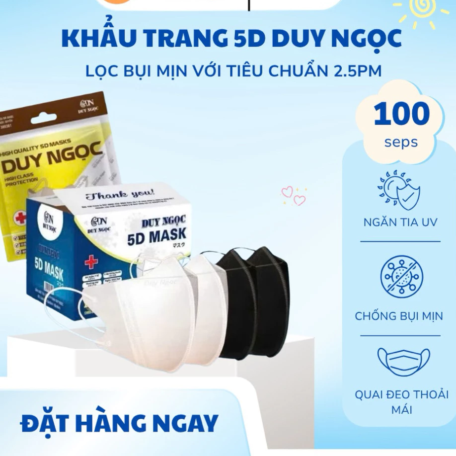 Khẩu trang 5D Duy Ngọc là một sản phẩm khẩu trang 5D được sản xuất bởi công ty Duy Ngọc. Sản phẩm này được thiết kế để cung cấp hiệu quả bảo vệ cao cho người dùng.