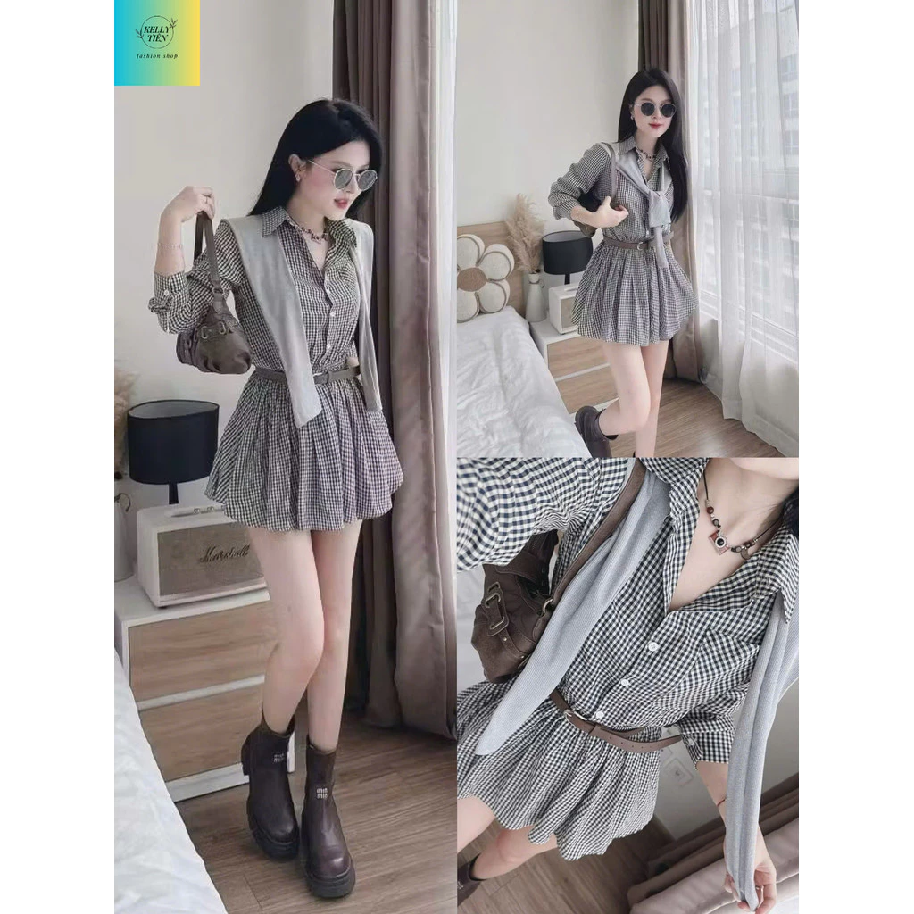 Khám Phá Sản Phẩm: Set Váy Kẻ Sơ Mi Caro Dáng Xòe Túi Ngực Vintage Basic